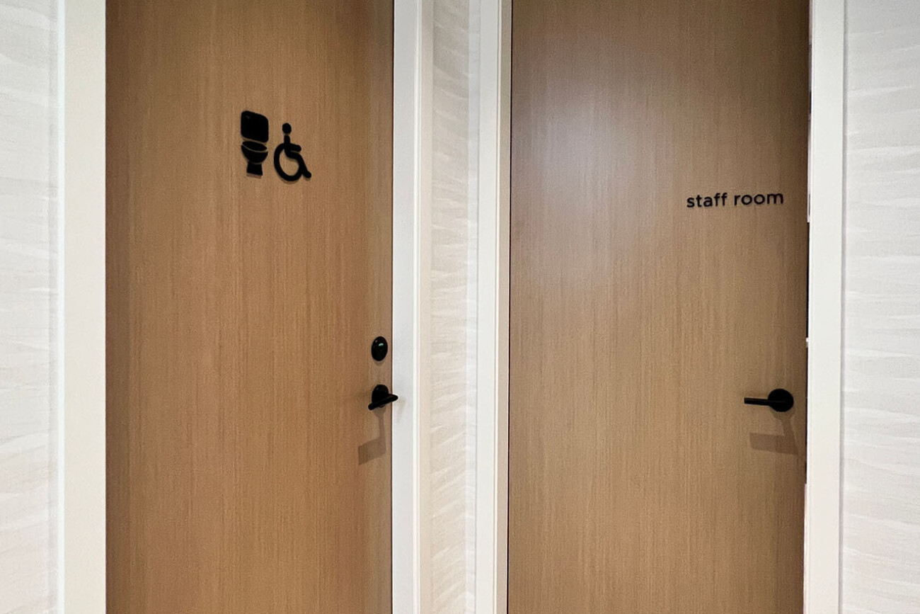 Each room is marked with custom acrylic text on the glass. Firstly, matte