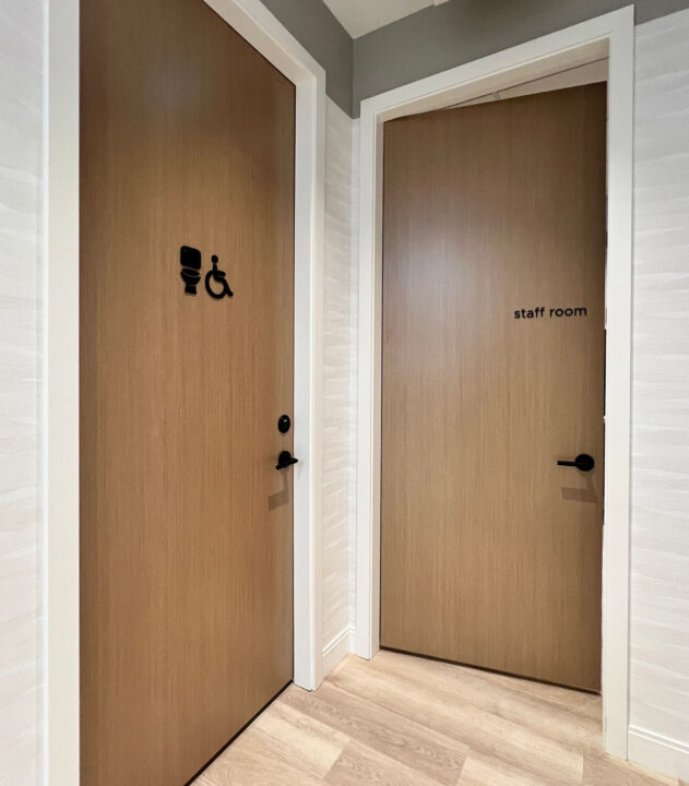 Each room is marked with custom acrylic text on the glass. Firstly, matte