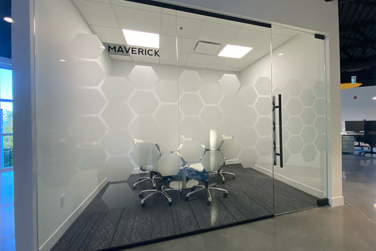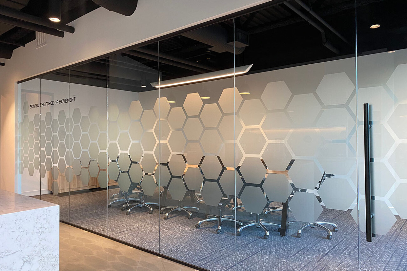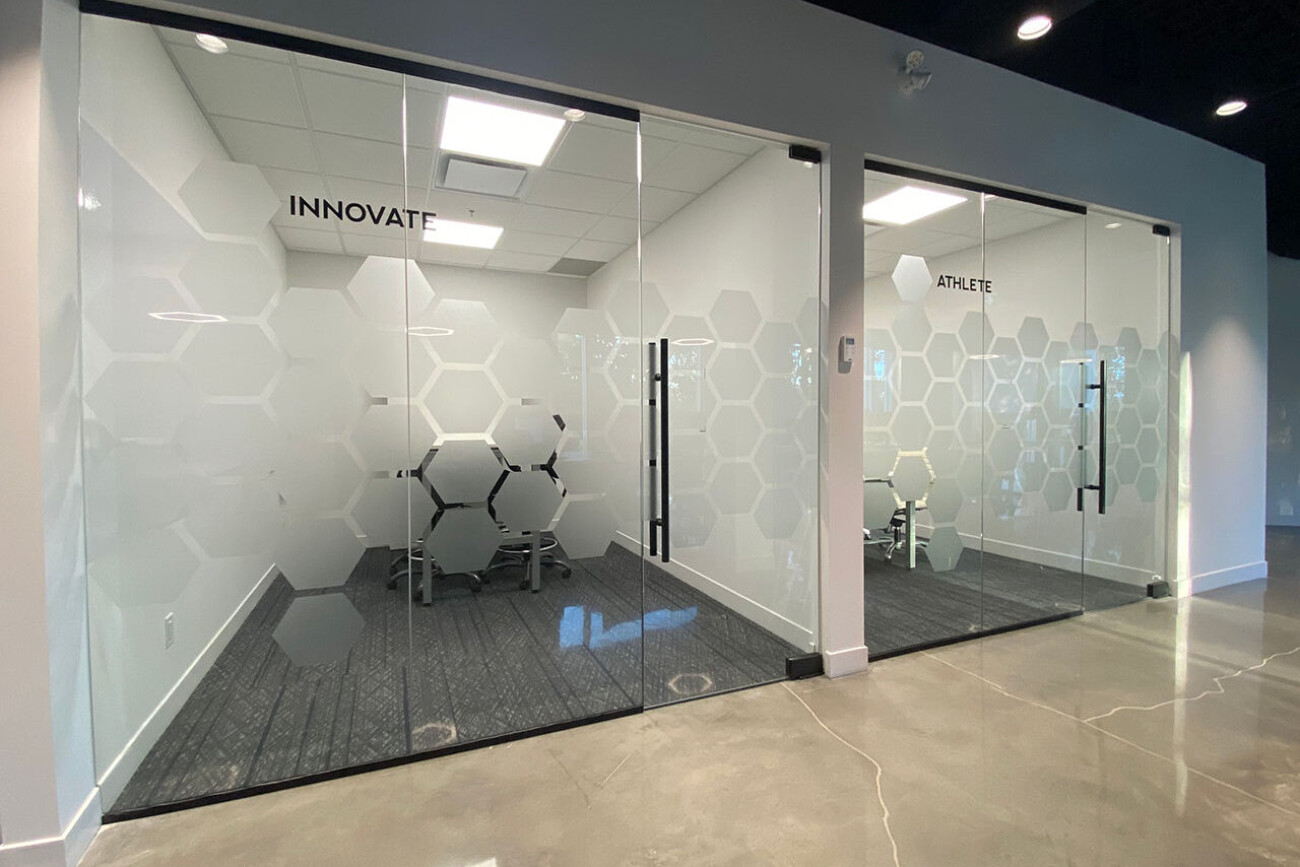 We created the entrance signage using 1/2″ thick clear acrylic with their logo printed and installed on the back. Next, we spray painted their names on the surface and sides black to match their branding. Our team lastly installed it onto the wall with spacers to add dimension to the signage.